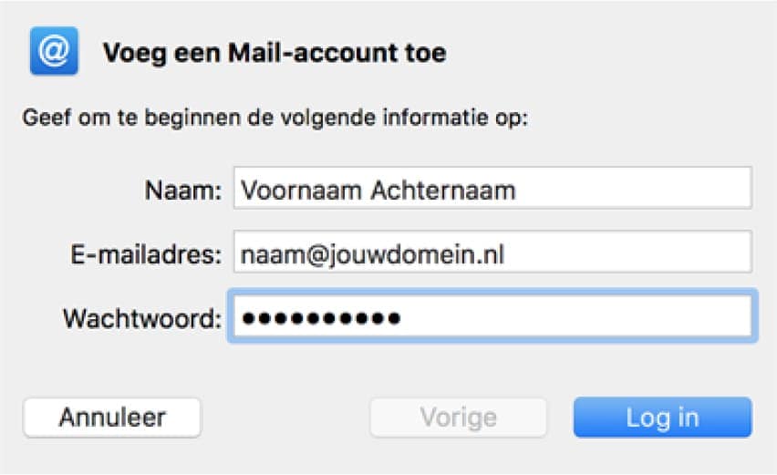 Inkomende en uitgaande mailserver: jouwdomein.nl (je eigen domeinnaam)
